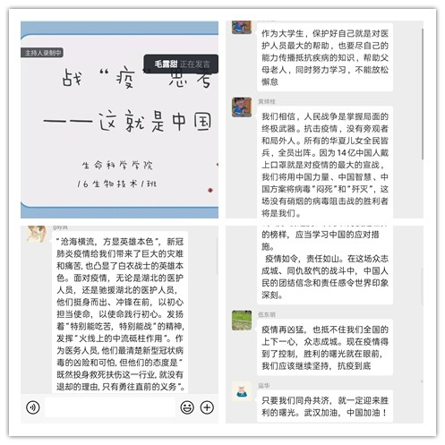 为深入贯彻落实习近平总书记关于新型冠状病毒肺炎疫情防控的重要指示精神,切实加强学生的思想教育和价值引领,根据我校党委学生工作部的安排,生命科学学院各班于3月16日-22日认真组织全体学生开展了主题为“战‘疫’思考――这就是中国”的线上班会。