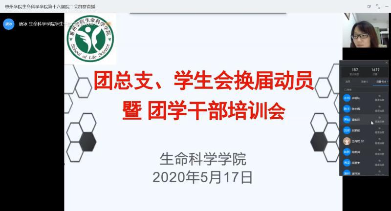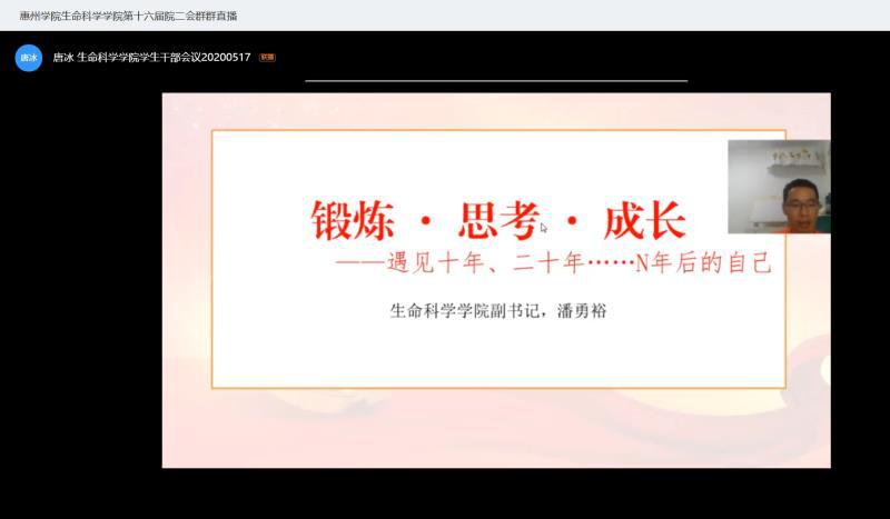 2020年5月17日晚,利用钉钉线上直播平台,我院召开了2020年春季团学干部培训交流会,也为即将进行的团总支、学生会换届做相关动员。本次会议由学院团总支书记唐冰主持,党总支副书记潘勇裕做学生干部培训,党总支书记梁红梅做总结讲话。