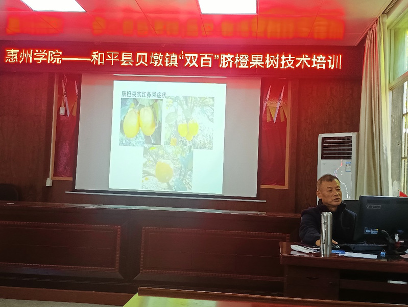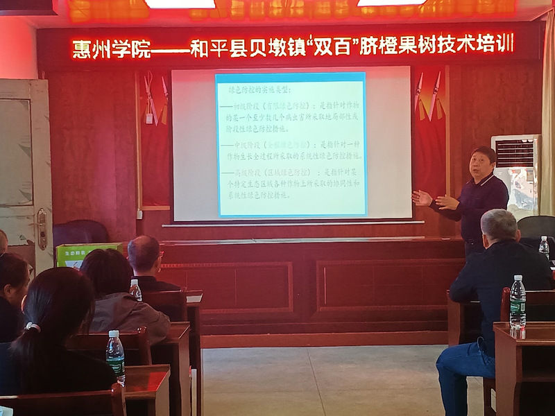 本网讯 为提升脐橙种植技术水平,推动产业高质量发展,2025年11月14日,我院与和平县科创中心、和平县贝墩镇镇政府和贝墩镇武联村委会联合主办的“2025年贝墩镇脐橙种植技术创新与绿色防控培训会”在贝墩镇武联村委会会议室举行。此次会议重点围绕脐橙黄龙病综合防治技术及绿色病害防控技术展开培训,助力果农实现增产增收。首先,著名的脐橙黄龙病防治专家、江西于都县农业技术推广中心研究员华斌针对严重威胁脐橙产业的黄龙病,讲解早期诊断技术、媒介昆虫(木虱)高效防控、抗病品种选育及生态调控措施 ,帮助果农科学应对。接着,学院钟平生教授讲解了生物农药、天敌昆虫应用、物理诱控及土壤健康管理等环境友好型技术,建议减少化学农药依赖,保障果品安全。