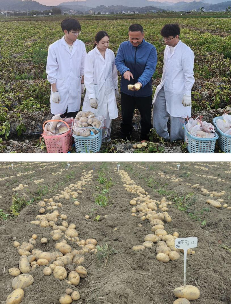 近期,项目组负责人再次带队到基地开展更为关键的田间测产工作。按品种分区,随机选取代表性样点,通过测量单位面积株数、单株结薯数,并取样测定薯块大小、商品薯率及单株产量等指标,来科学估算理论产量并评估实际生产潜力。在田间,大家小心地挖起植株,仔细分拣、计数、称重,记录着每个品种的“成绩单”。初步数据显示,15个参试品种在产量潜力、薯块性状、商品性等方面差异显著。这些详实的数据,将为下一步筛选出1-2个最适宜惠州栽培、兼具高产、优质、抗逆特性的马铃薯品种提供核心依据,也为后续集成“马铃薯-绿肥-水稻”水旱三熟轮作模式打下关键的品种基础。